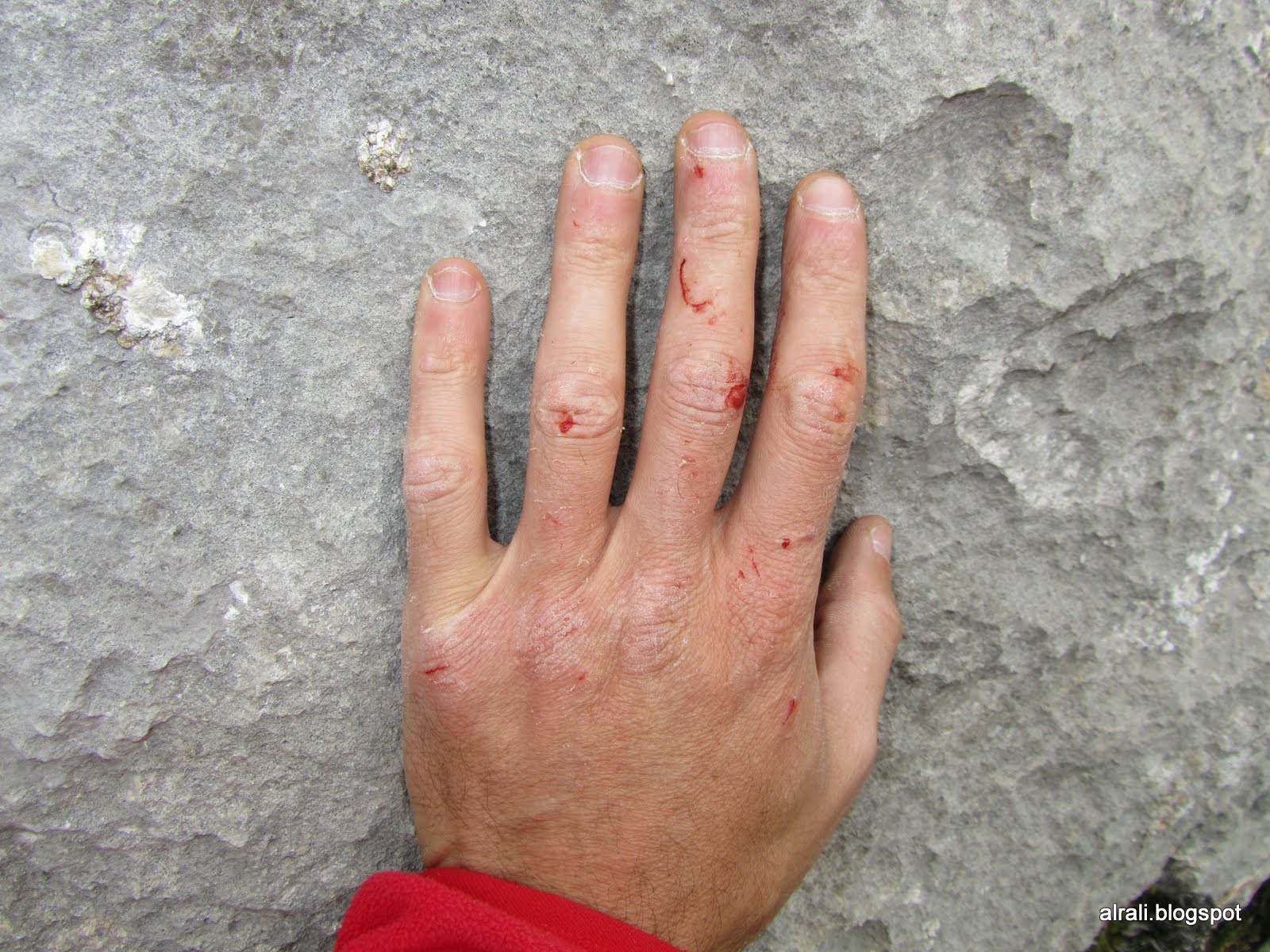 Me sangran las dos manos, el frío tensa la piel y las maniobras de empotre en fisura, más las de colocar y retirar los seguros me las han dejado hechas una pena.