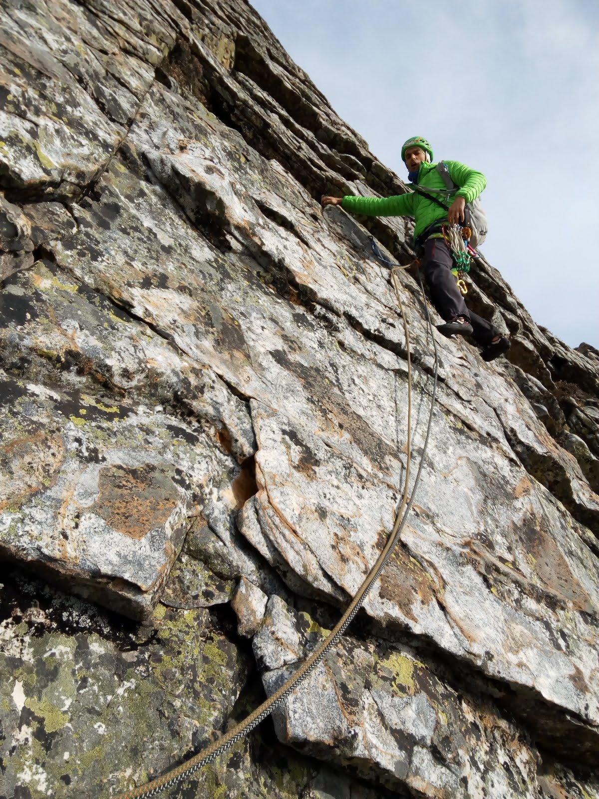 La siguiente tirada se ve de navegación, y se la cedo de nuevo a Fernando, que resuelve con soltura mientras yo me pongo la chaqueta de fibra debajo de la chupa. Por fin empiezo a regular, y disfruto de la escalada más que antes.